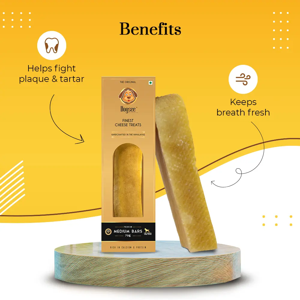 Dogsee Singles Medium is ideal for keeping your medium-breed dog happy and entertained for hours. These long-lasting dental chews are made from the finest Himalayan cheese that has been smoked and sun-dried for over 35 days. These reduce the likelihood of plaque and tartar buildup and freshen the breath, making them the best alternative to brushing.