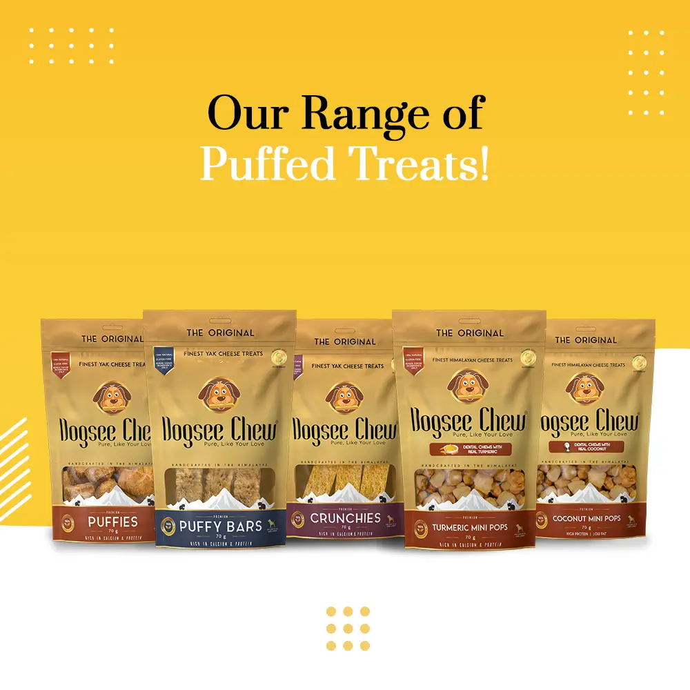 Puffies are 100% natural, flavorful, soft dog training treats made from Himalayan cow and yak milk cheese. These easy-to-feed, bite-sized dog treats are ideal for puppy training because they are high in protein and low in fat, which aids in the dog's weight management.